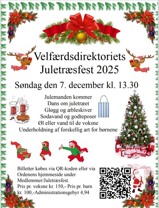 Billetter købes via QR-koden eller via Ordenens hjemmeside under Medlemmer/Juletræsfest. Pris pr. voksne kr. 150,- Pris pr. barn kr. 100,-Administrationsgebyr 4,94